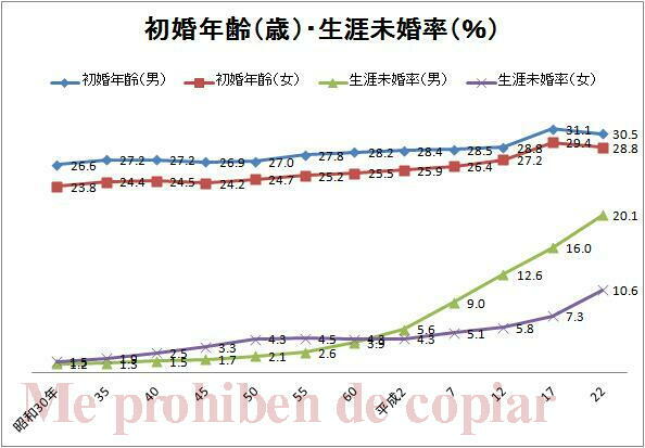 昭和50年以降は、初婚年齢は上昇して、2013年(平成25年)には男:30.9歳・女:29.6歳に、生涯未婚率は男性20.14%・女性10.61%まで上昇しています。これは、女性の経済的独立や結婚への社会的圧力の減少など複数要因が考えられますが、男女とも出会いが少ないと結婚をしない理由に挙げます。職場やお見合いなど出会いの場を提供していた機能不全が大きいかもしれません。 |
