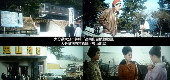 ロケ地は大分県です。浅丘ルリ子の実家の牧場は「久住高原」、小林旭が降り立つのは別府港、小林旭が失踪中の牧場主の妻小園蓉子の園子供と遊びに行くのは「高崎山自然公園」や別府「海地獄」などでロケが行われています。 |