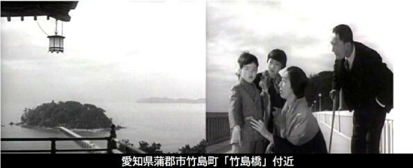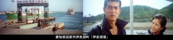 石原裕次郎は、殺し屋の故郷蒲郡を訪れます。蒲郡駅に降り立ち、蒲郡高校で聞込みをし、蒲郡ボートれーす上で働く情婦の渡辺美佐子の母の初井言栄を田津ね、宿泊先の竹島橋近くの「蒲郡ホテル(現:蒲郡クラシックほてる」に行きます。 |