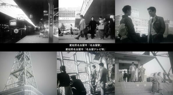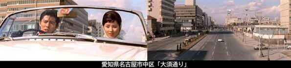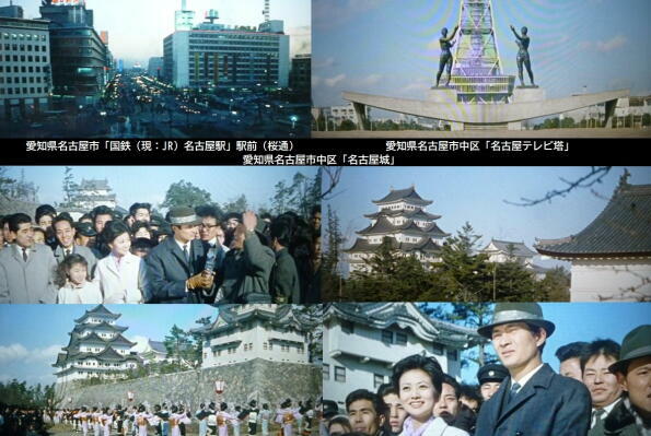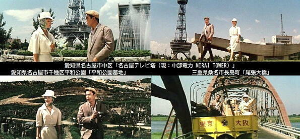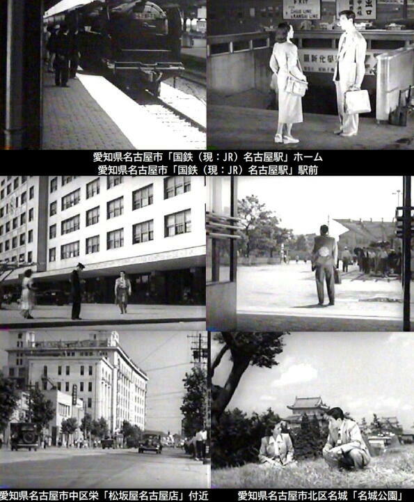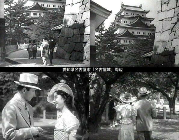 ロケは名古屋駅、同市内、静岡市などでも行われています。名古屋駅に降りた桂木洋子は栄通りにある中部支社に向います。また、鶴田浩二はストリッパーと失踪した社長が静岡にいることを桂木洋子に教えるのは「名城公園」です。 |