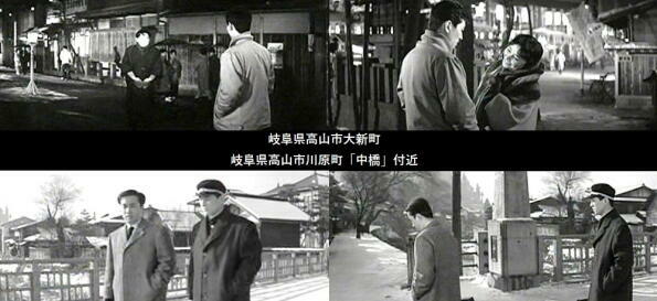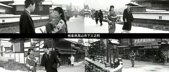 冬の高山氏が舞台です。高山市「中橋」付近、下三之町、大新町などでロケが行われています。なお、「中橋」は、本町一丁目と上三之町を結ぶ橋で、映画撮影後の1965年(昭和40年)に欄干を取替られ、。現在の朱色になっています。 |