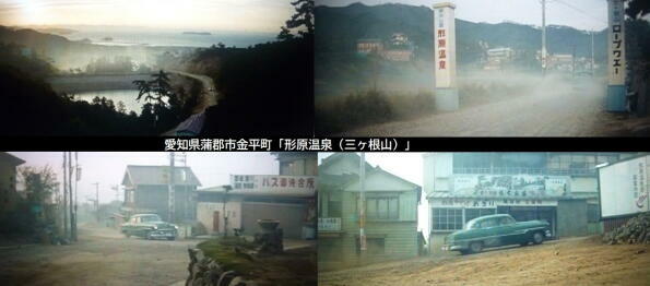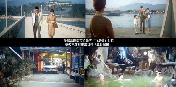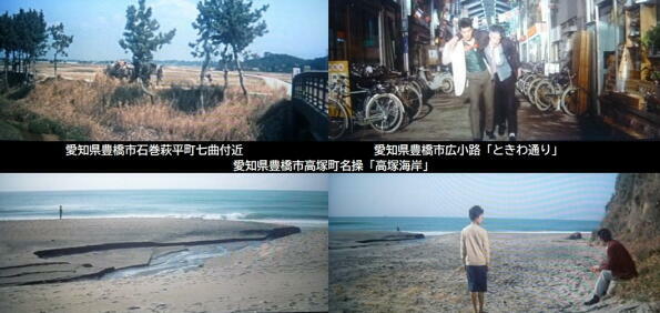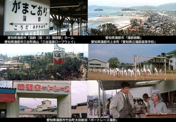 ロケ地は、主な愛知県の三河地方です。渡哲也が降り立つ架空の「三河石浜駅」は、「蒲郡駅」の名鉄側の駅舎です。その他、「吉良損田」や現在は廃業した三ケ根山の「三洲園ホテル」、渡哲也が松原智恵子の故郷に向かう田原市の伊良湖港フェリー乗場などでロケが行われています。また、名鉄蒲郡線の電車が楽しめます。 |