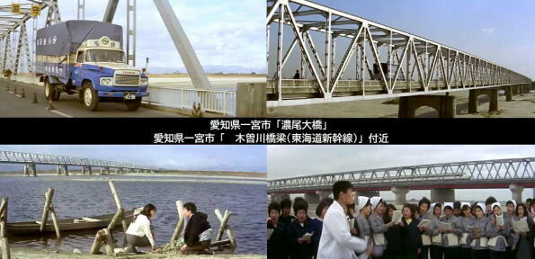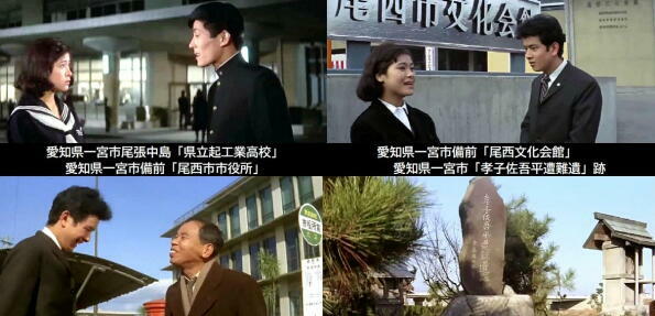 主なロケ地は愛知県尾西市(現:一宮市)、犬山市、岐阜県岐阜市などです。西尾三枝子が働く工場は「蘇東興業株式会社」、合唱の練習をするのは「木曽川橋梁(東海道新幹線)」河原付近、西尾三枝子の通う定時制高校は尾張中島「県立起工業高校」、西尾三枝子の父中村是好を山内賢が案内をするのは一宮市「孝子佐吾平遭難遺跡」や犬山市犬山北白山平「成田山など、ハイキングに出かけるのは犬山市「善光寺公園展望台」などです。 |