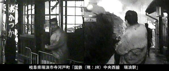 正木は墓を掘り起こした首をもって、茨城県の赤塚駅から東京へ向かいます。「赤塚駅」は水戸線に実在する駅ですが、ロケは岐阜県の中央西線の「瑞浪益」と思われます。上記錦紗は、撮影当時木曽福島機関区所属の「D51781」が牽引しています。また、中央西線は1968年(昭和43年)8月16日:中津川駅 に瑞浪駅間が電化されており、映像に架線がある関係と山の稜線から「瑞浪益」と推定しました。 |