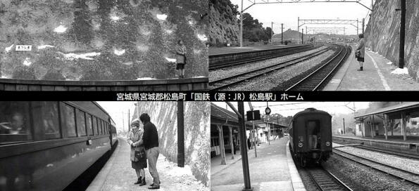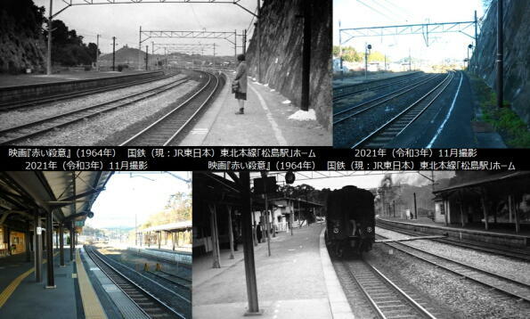 「松島駅」は、1890年(明治23年)に開業します。1962年(昭和37年)に山上の初代松島駅は廃止され、1944年(昭和19年)に開業した新松島駅(新松島信号場)が、1962年(昭和37年)に二代目「松島駅」になります。2009年(平成21年)に現在の駅舎が完成しました。構内には山の開削した切通しになっており、映画もこの切通しを利用した撮影になっています。 |